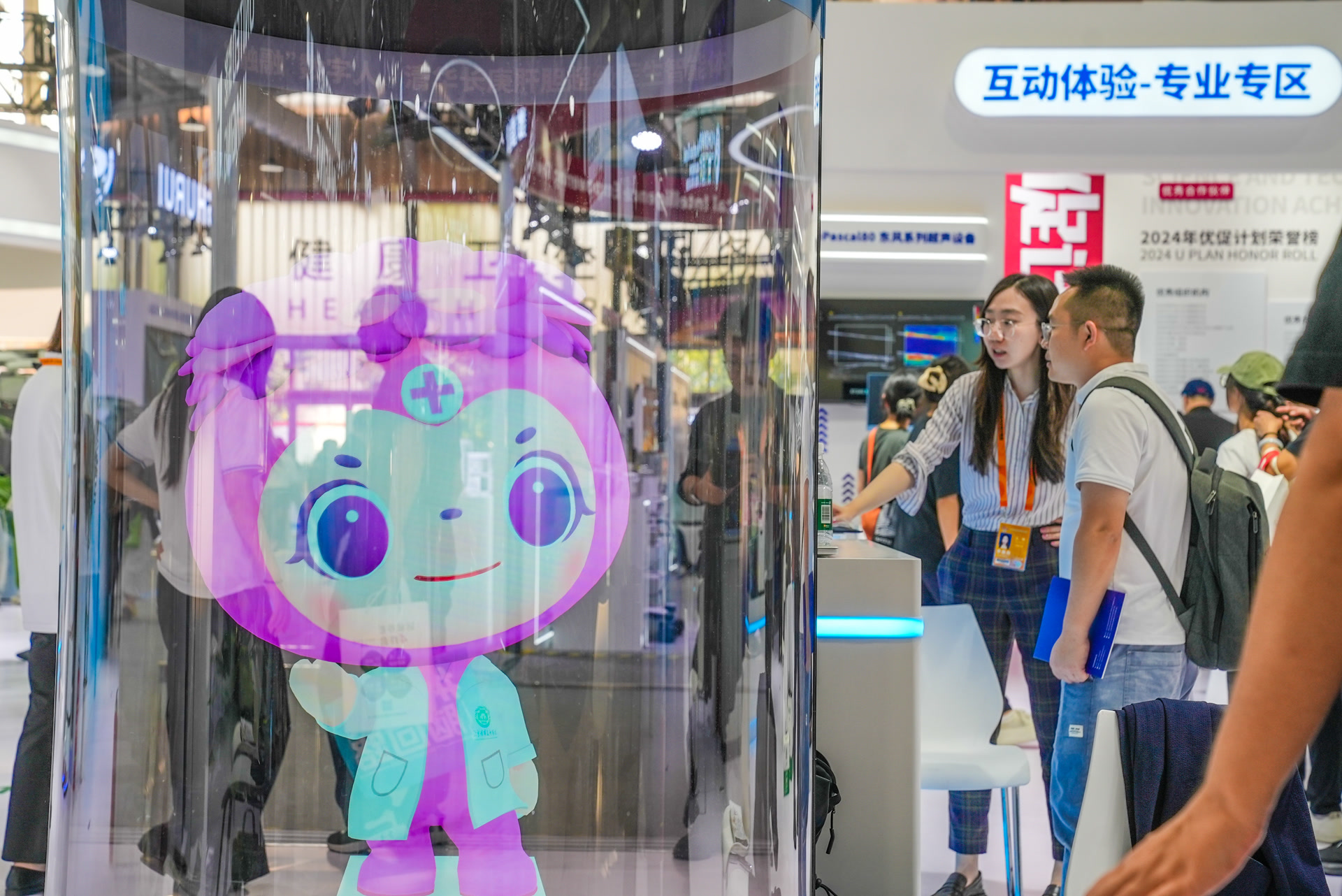 “您好,我是您的健康助手融融,有什么需要咨询的吗?”在展台,一位栩栩如生的AI虚拟医生“融融”正在与观众互动。作为本次参展的核心产品之一,由北京清华长庚医院院长董家鸿院士领衔研发的全息数字人“融融”与面向医生的“AI肝胆超级医生”系统,能够通过语音或触屏与现场观众交流,帮助大家体验肝胆疾病的智能科普、咨询和临床决策服务。